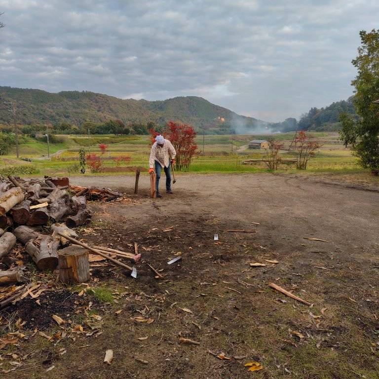 初めての鍬・斧を手にされ、木曽野師匠の指導で器具を使いこなし『パーン!』と見事に薪割りをされ喜びのハイジャン
