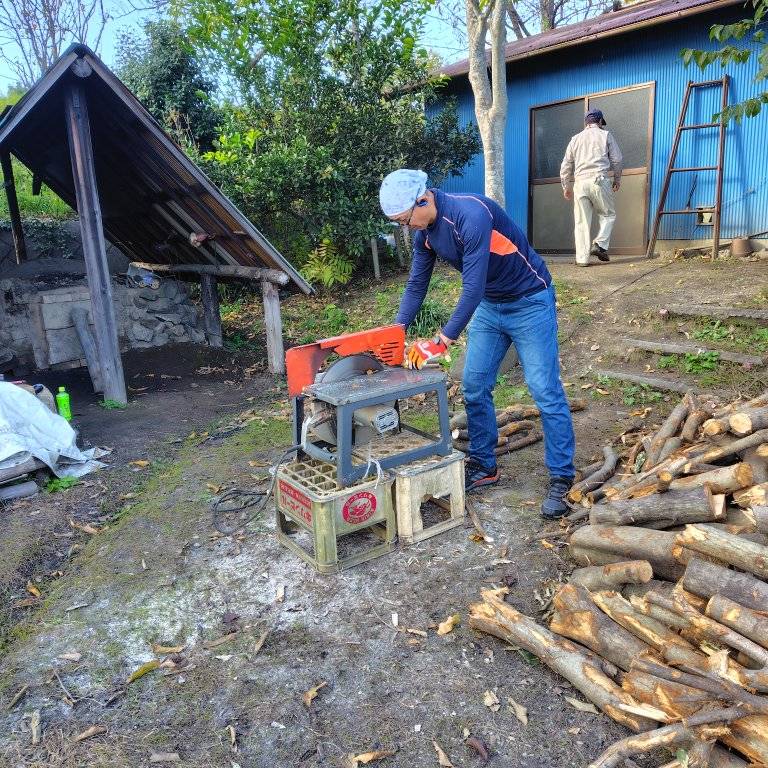 本日は「半兵衛炭焼塾」のオーバーオールを着て木曽野師匠と伐採した木をさらに裁断し炭木を作りました。