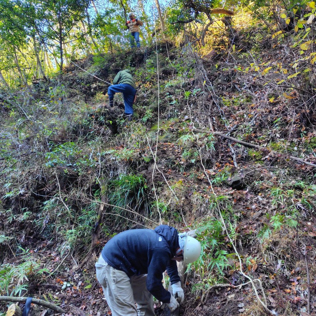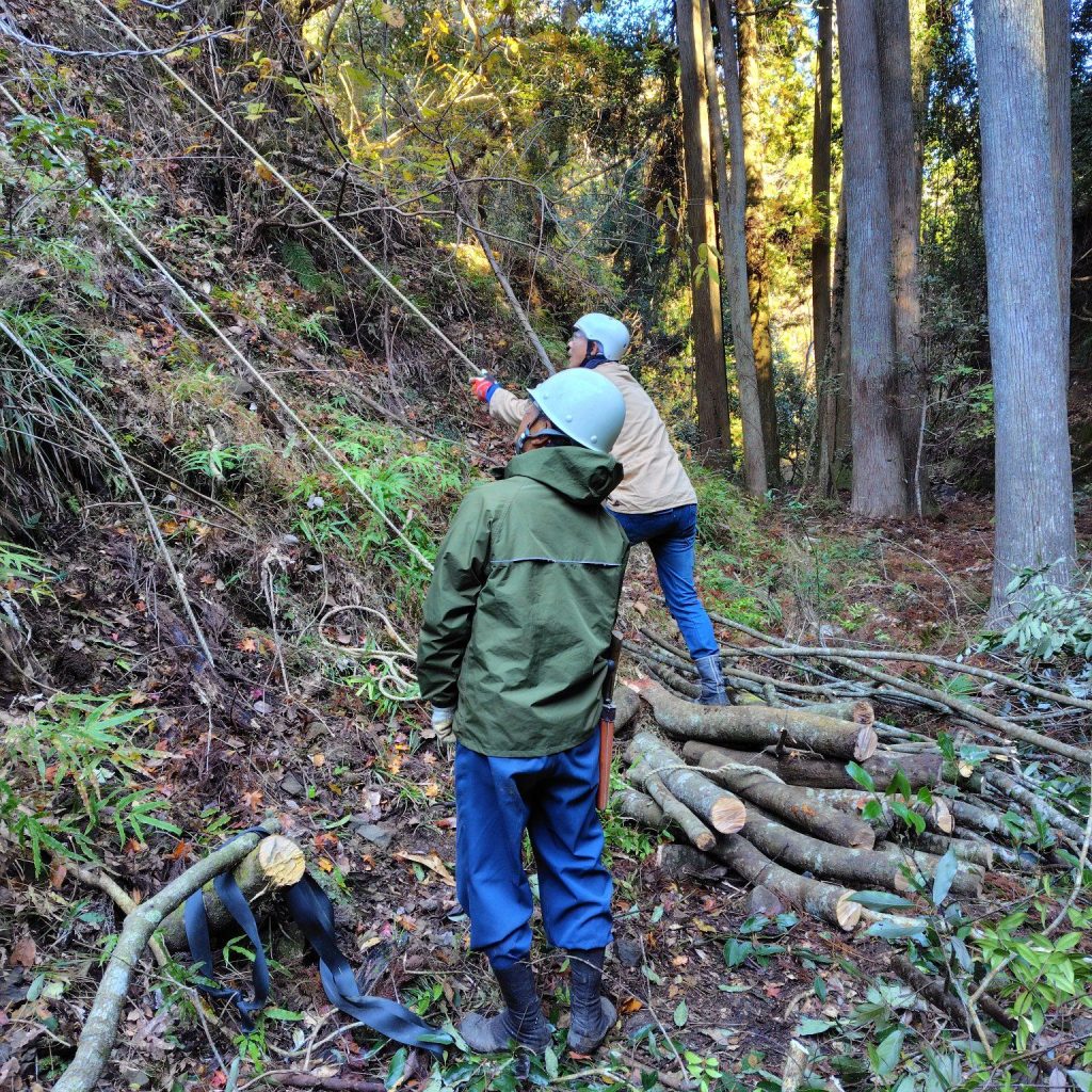 木の倒れる方向を木曽野師匠が確認し伐倒。崖下に伐採された木々の枝を払い、1メートル大に玉切りをしました。