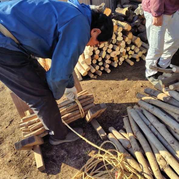 大きな窯での炭焼きに向け、木を立て込みしています。