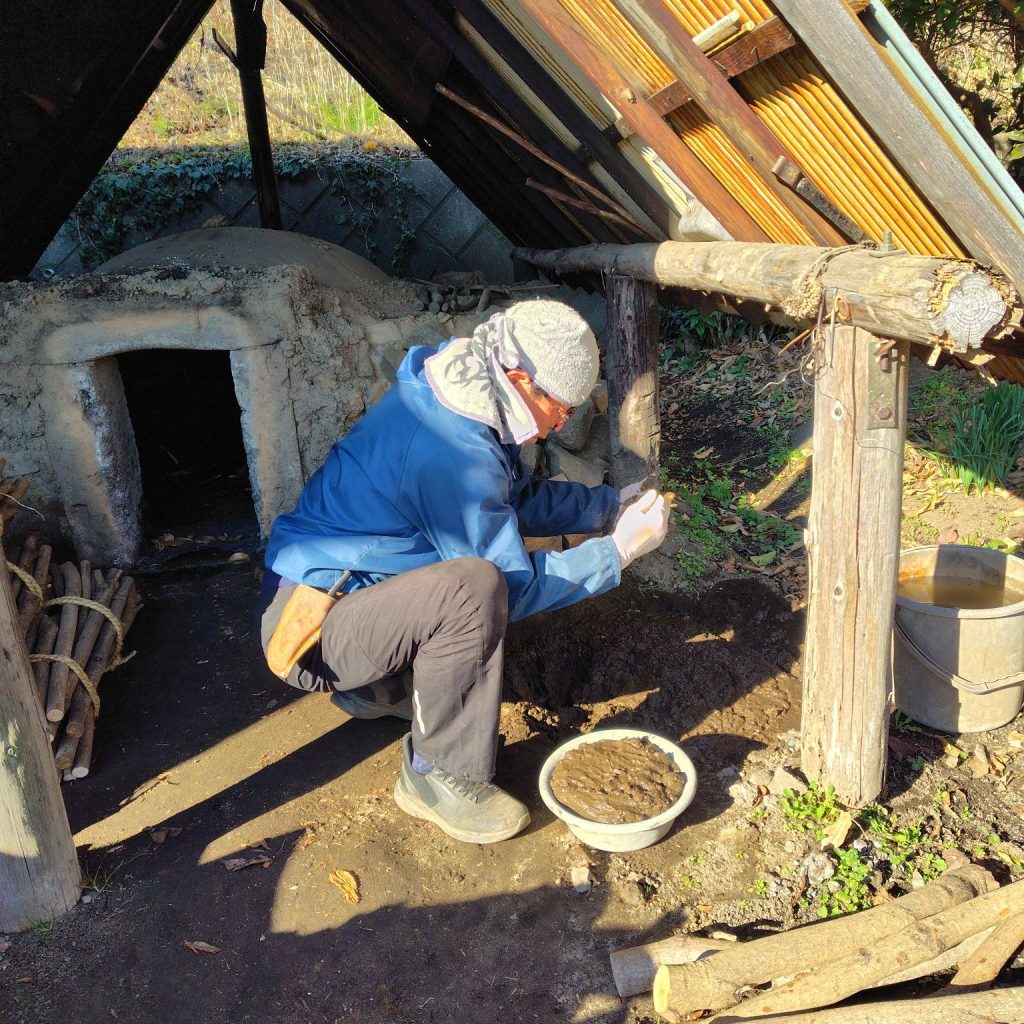 ネラシの工程を無事に終え、最後の止め窯へ。ベト(泥の粘土)を張り付けるのにはコツがいるが、手首のスナップをきかせながらで全ての穴を塞ぐ。