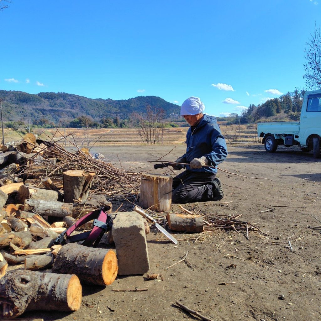 そのため、本日も山へ伐採に。伐採した木々の枝をはらい、金矢で薪割り。炭焼き開始までもう少し!