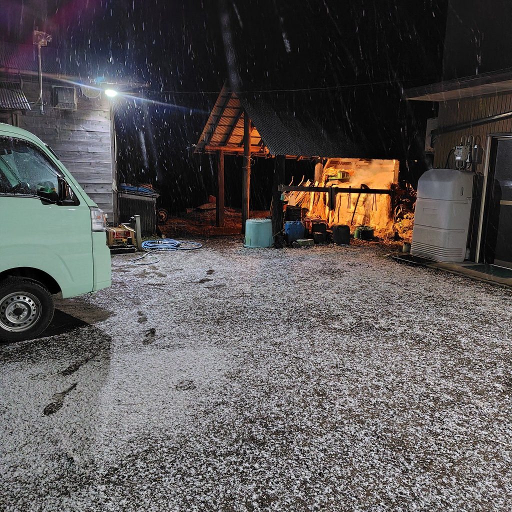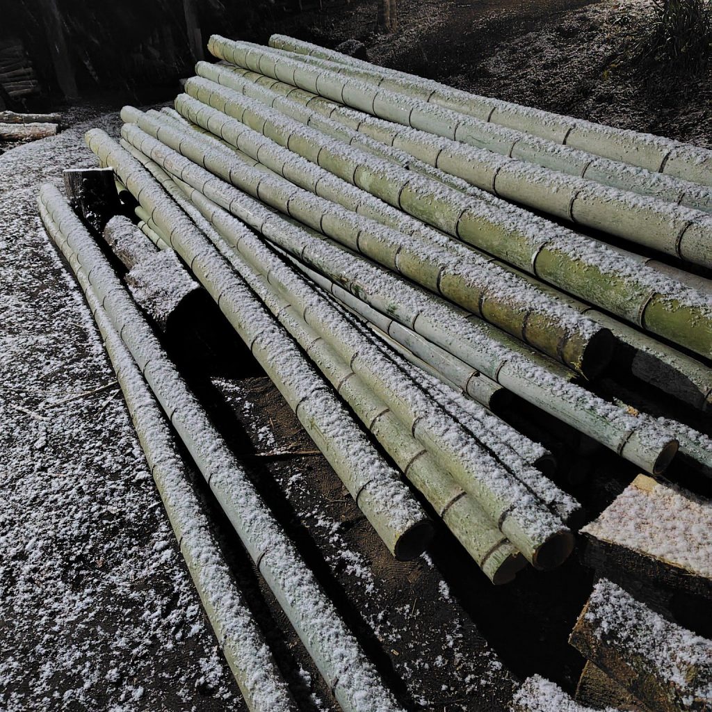 夜に作業をしていると雪が降り、本日炭焼き合間に竹林伐採にいった竹にうっすら積もっていました。